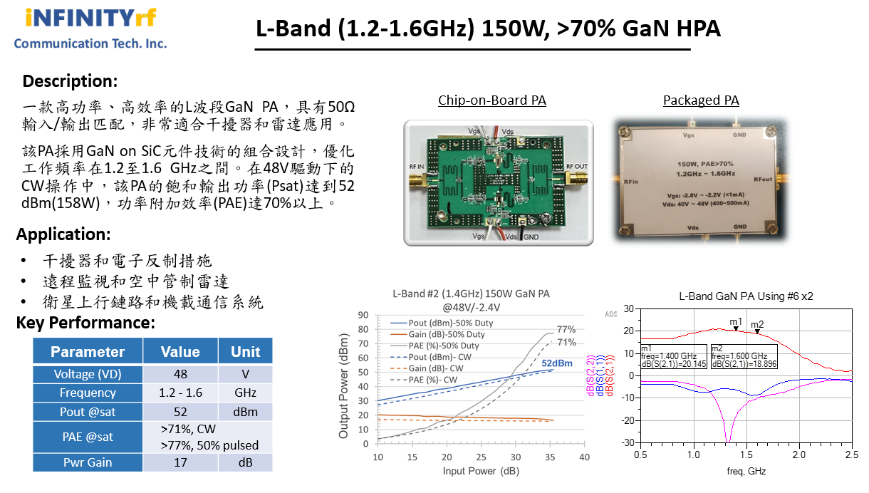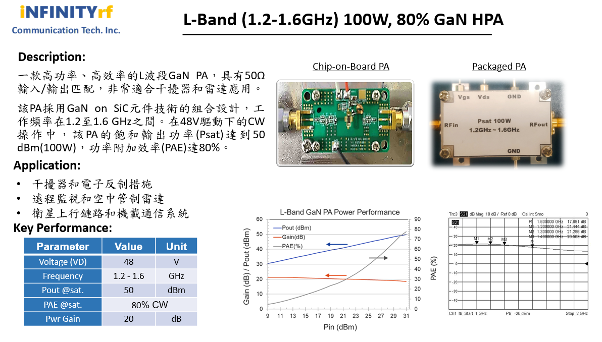 易達通公司聚焦高頻、高功率密度、高效能 RF GaN PA 產品之核心能力,成功推出單顆 GaN PA 模組_100W(50dBm) & PAE>80% ,滿足客戶對於長距離傳輸、低失真、更佳的訊號品質或高功率訊號反制之需求。